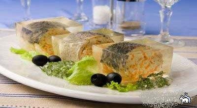 Ингредиенты: примерно 2 кг судака или трески, лук репчатый 2 шт., морковь 1 – 2 шт., корень петрушки, 1 пучок зелени, желатин (40 г на 1 литр бульона).