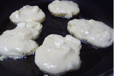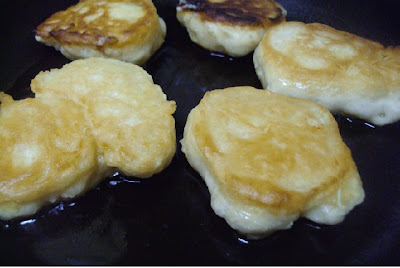 Далее жарим на сковороде с раст.маслом как обычные оладики, т.е на разогретое масло выкладываем тесто, набирая его мокрой ложкой. После каждого оладика ложку окунаем в хол. воду и затем набираем следующий оладик и т.д. Обжариваем с двух сторон.