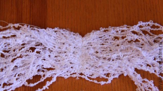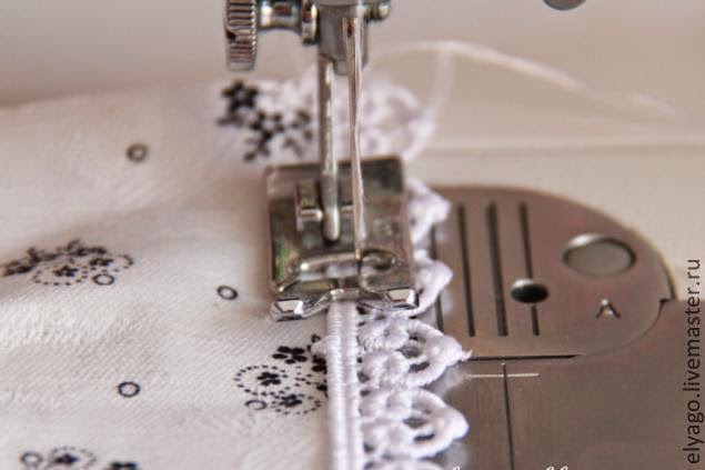 Затем также швом назад иголку прищиваем кружево, чуть его присборив по верхнему краю