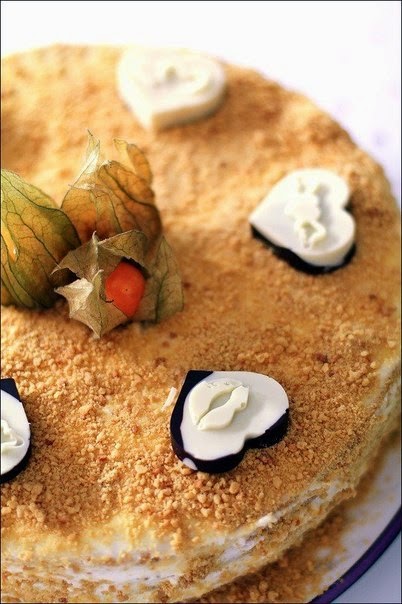 11. Каждый корж и бока промазать кремом. Обрезки размолоть. и посыпать верх и бока торта.