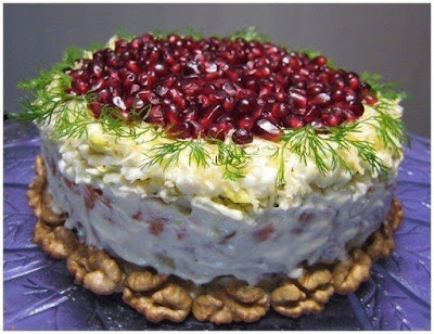 Сверху салат украсить зернами граната, зеленью и грецкими орехами. Салату обязательно нужно дать время для пропитки в холодильнике.