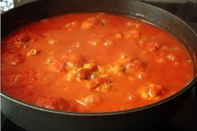 В сковороду с курицей добавить нарезанный лук, томатное пюре (приготовить самостоятельно или использовать готовое, главное — не путать пюре с томатной пастой), вино (Мадера, портвейн), соль и перец. Если соус получается густым, добавьте немного мясного бульона. Мне этого не потребовалось.