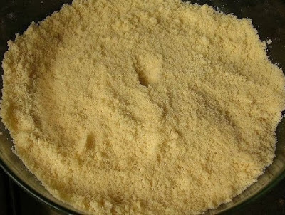 В муку добавляем разрыхлитель, соль и сахар. Смешиваем мучную смесь с холодным сливочным маслом и перетираем, чтобы получилась вот такая рыхлая крошка.Делать это надо довольно быстро, чтобы масло не успело согреться.