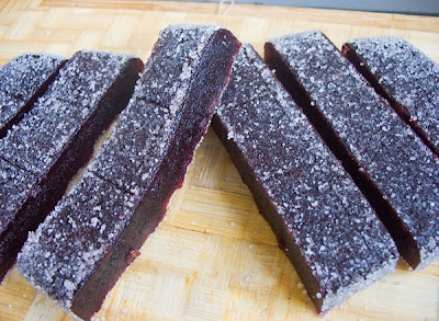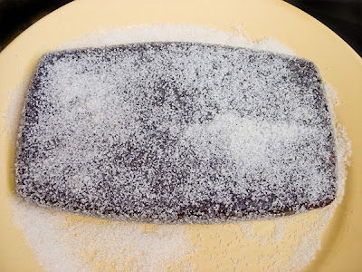Посыпаете его сахарным песком, притоптываете сахар ладошкой (желательно через пленку), даете постоять так еще некоторое время. Далее аккуратно разрезаете на полоски, а потом на квадраты, макаете торцы в сахарный песок и складываете в коробку, перекладывая слои пекарской бумагой или промасленной калькой, чтобы не слиплось.