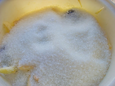 Нарезанное кладем в подходящую миску и засыпаем сахарным песком примерно такого же объема, как и сливы.