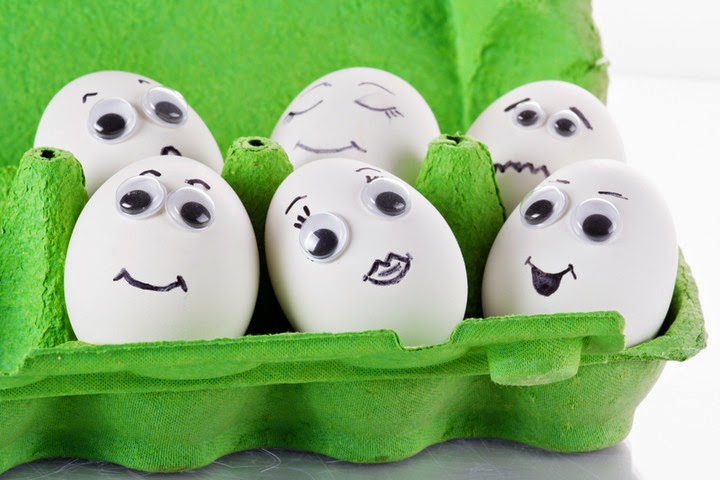 А можно ничего не красить и не обклеивать, а просто с помощью фломастера нарисовать лица на яйцах. Бегающие глазки можно приобрести в канцелярском магазине в отделе для детских поделок, если же таковых не нашли, то можно просто нарисовать глаза фломастером.