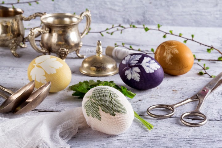 Из природных средств для украшения можно использовать листики петрушки, укропа, кинзы, тимьяна, розмарина и других специй и трав. Для этого нужно приложить листик к вареному яйцу и обтянуть его марлей, концы завязать ниткой и лишнее отрезать. Окрасить красками или натуральными красителями. Дать высохнуть и аккуратно снять марлю и листики. Марля пропустит краску, а листики нет и на яйцах останутся красивые отпечатки.