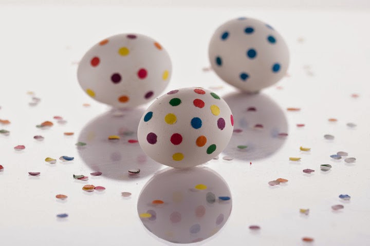 Очень ярко и празднично выглядят яйца, украшенные конфетти. Можно использовать готовые конфетти или сделать их самостоятельно, вооружившись дыроколом. Приклеить конфетти можно на клей или клейстер.