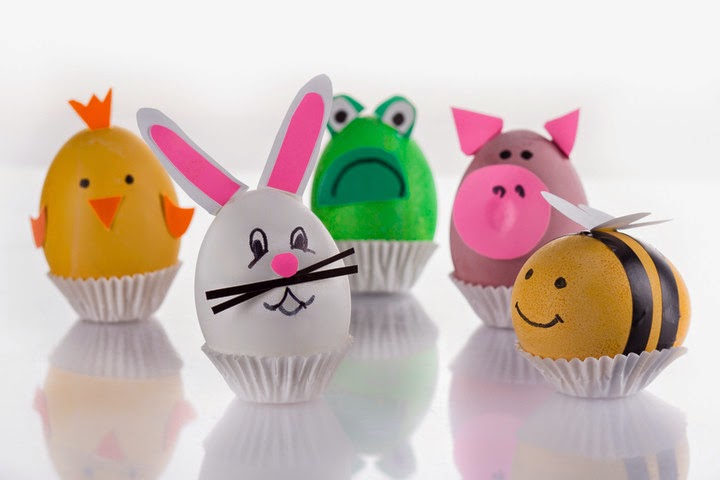 Можно сделать забавные мордочки зверушек и порадовать пасхальными яйцами деток. Для этого предварительно отварить и окрасить яйца. Из цветной бумаги вырезать носики и ушки, приклеить к яйцам. Черным фломастером дорисовать детали — глазки, ротики.